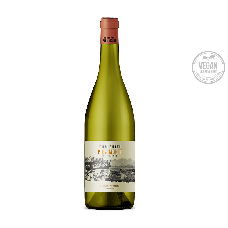 (1) botella de DURIGUTTI PIE DE MONTE INMIGRANTES BLANCAS DE PIE FRANCO. Blend de blancas a base de Chenin, Pedro Ximénez sutil aporte del Torrontés para un