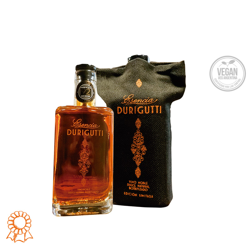Estuche con 1 botella de Esencia Durigutti. Vino noble dulce natural botritizado. Recibida la uva en bodega se prensa directo en racimo entero. El mosto flor fermenta alcohólicamente con levaduras indígenas en dos barricas de primer y segundo uso. Crianza en las mismas barricas en sistema solera durante 10 años.